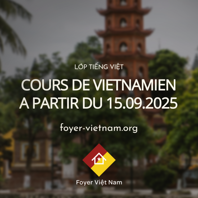 Manuel utilisé : Le Golden book Tiếng Việt cơ sở – Le vietnamien de base, connu en version anglaise, existe désormais en français pour répondre aux besoins de l’apprentissage du vietnamien par les francophones. Il est en vente au Foyer Vietnam.