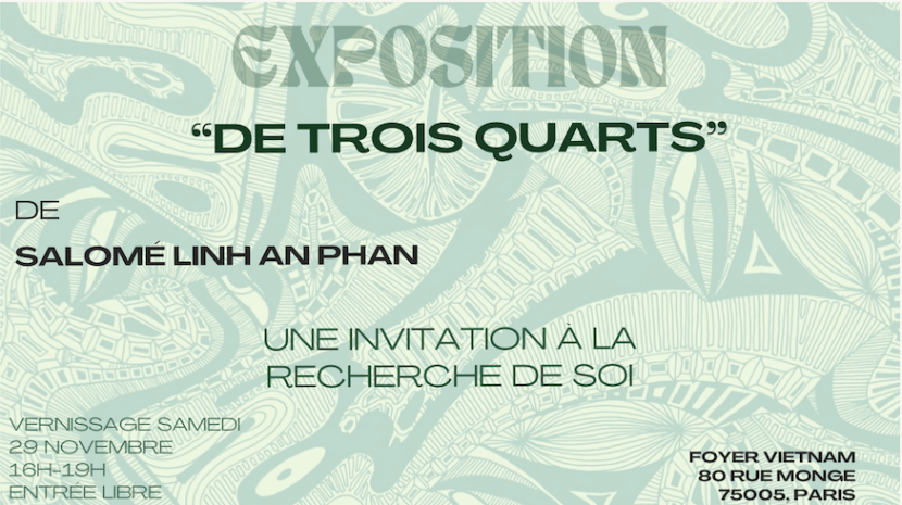 L'exposition « De trois quarts » de la jeune artiste Salomé Linh An Phan nous invite à voguer loin de l'illusion dystopique, vers un monde où l’œil s'attarde sur le détail, trouble. Par son jeu de regards avec le spectateur, on s'amuse à découvrir les nombreuses faces cachées, à se laisser vibrer par le mariage du fond et de la forme. Plus d'infos ici